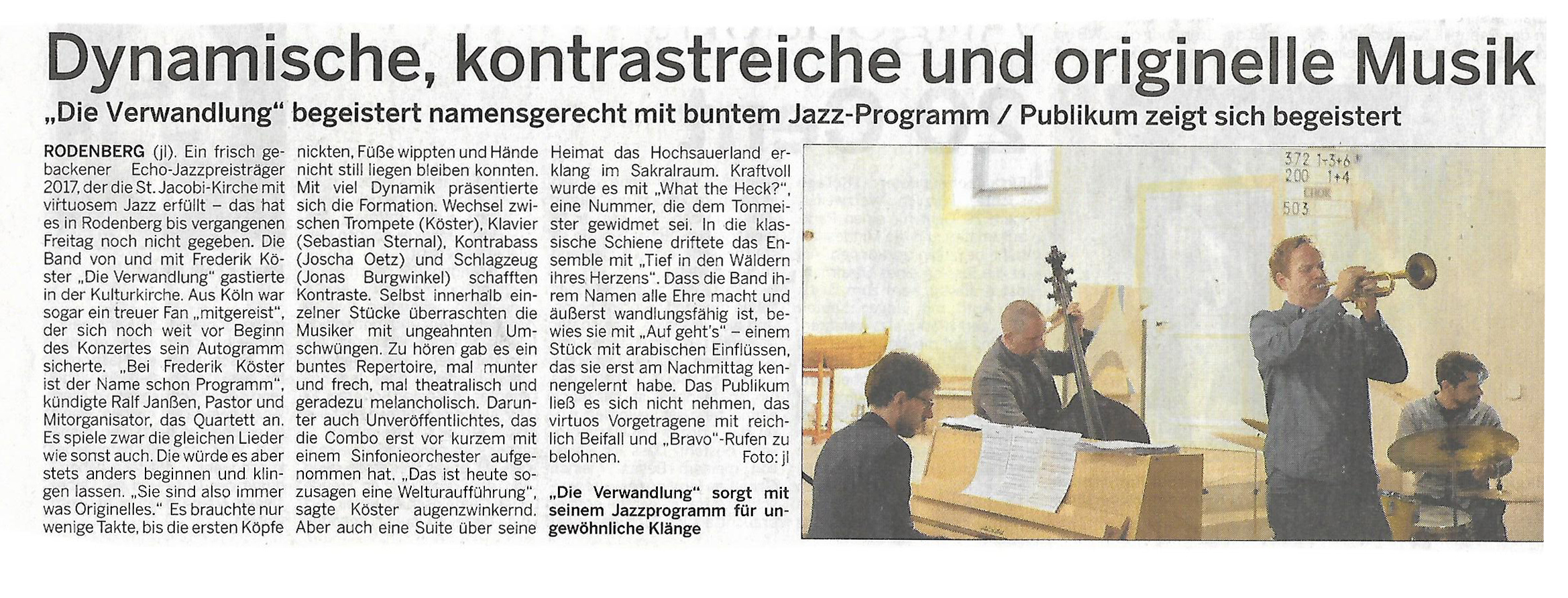Ein frisch gebackener Echo-Jazzpreisträger 2017, der die St. Jacobi-Kirche mit virtuosem Jazz erfüllt – das hat es in Rodenberg bis vergangenen Freitag noch nicht gegeben. Die Band von und mit Frederik Köster „Die Verwandlung“ gastierte in der Kulturkiche. Aus Köln war sogar ein treuer Fan „mitgereist“, der sich noch weit vor Beginn des Konzertes sein Autogramm sicherte. „Bei Frederik Köster ist der Name schon Programm“, kündigte Ralf Janßen, Pastor und Mitorganisator, das Quartett an.