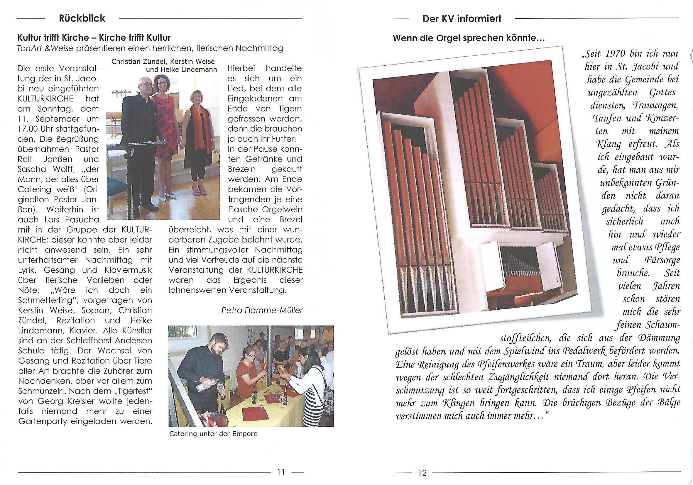 Die erste Veranstaltung der in St. Jacobi neu eingeführten Kulturkirche hat am Sonntag, dem 11. September um 17:00 Uhr stattgefunden. Die Begrüßung übernahmen Pastor Ralf Janßen und Sascha Wolff, „der Mann, der alles über Catering weiß“ (Originalton Pastor Janßen). Weiterhin ist auch Lars Pasucha mit in der Gruppe der Kulturkirche; dieser konnte aber leider nicht anwesend sein.